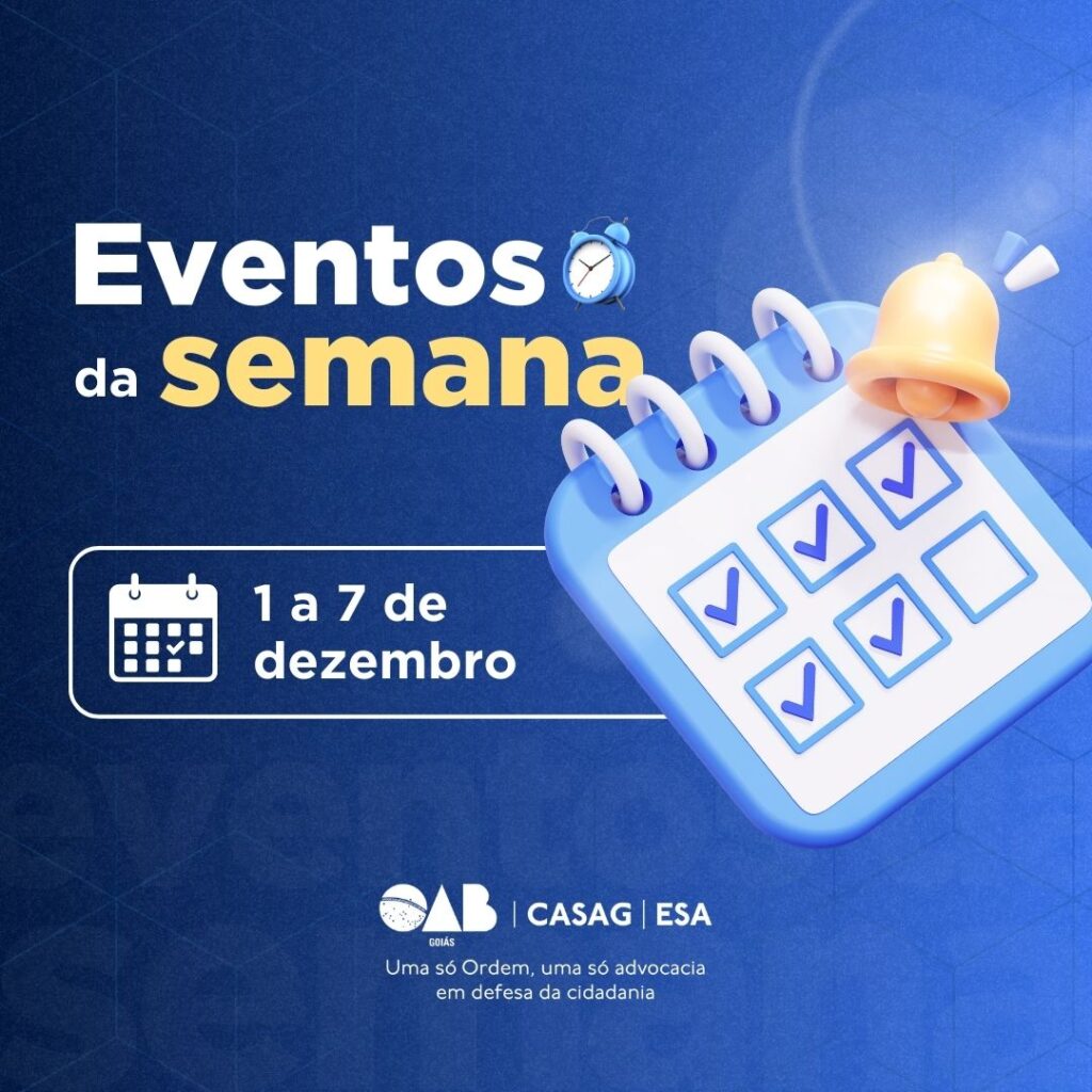 A Ordem dos Advogados do Brasil – Seção Goiás (OAB-GO) divulga a agenda oficial de eventos da semana de 1º a 7 de dezembro, marcada por atividades voltadas ao fortalecimento profissional da advocacia e por ações de integração e responsabilidade social.