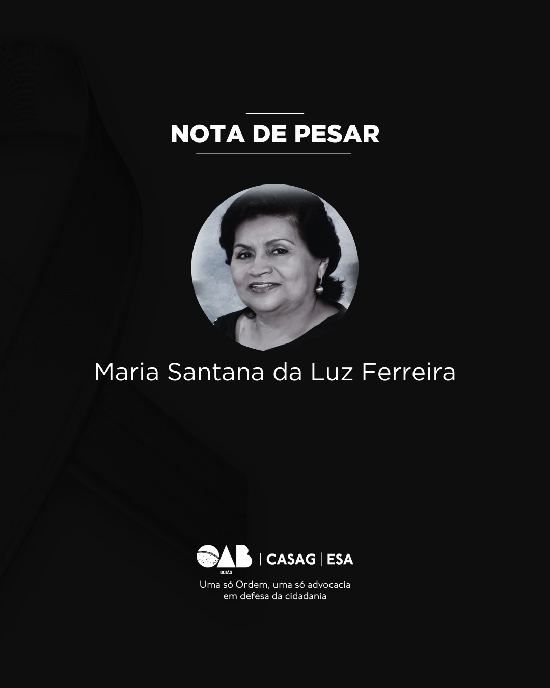 OAB-GO e Subseção de Aparecida de Goiânia lamentam o falecimento de Maria Santana da Luz Ferreira