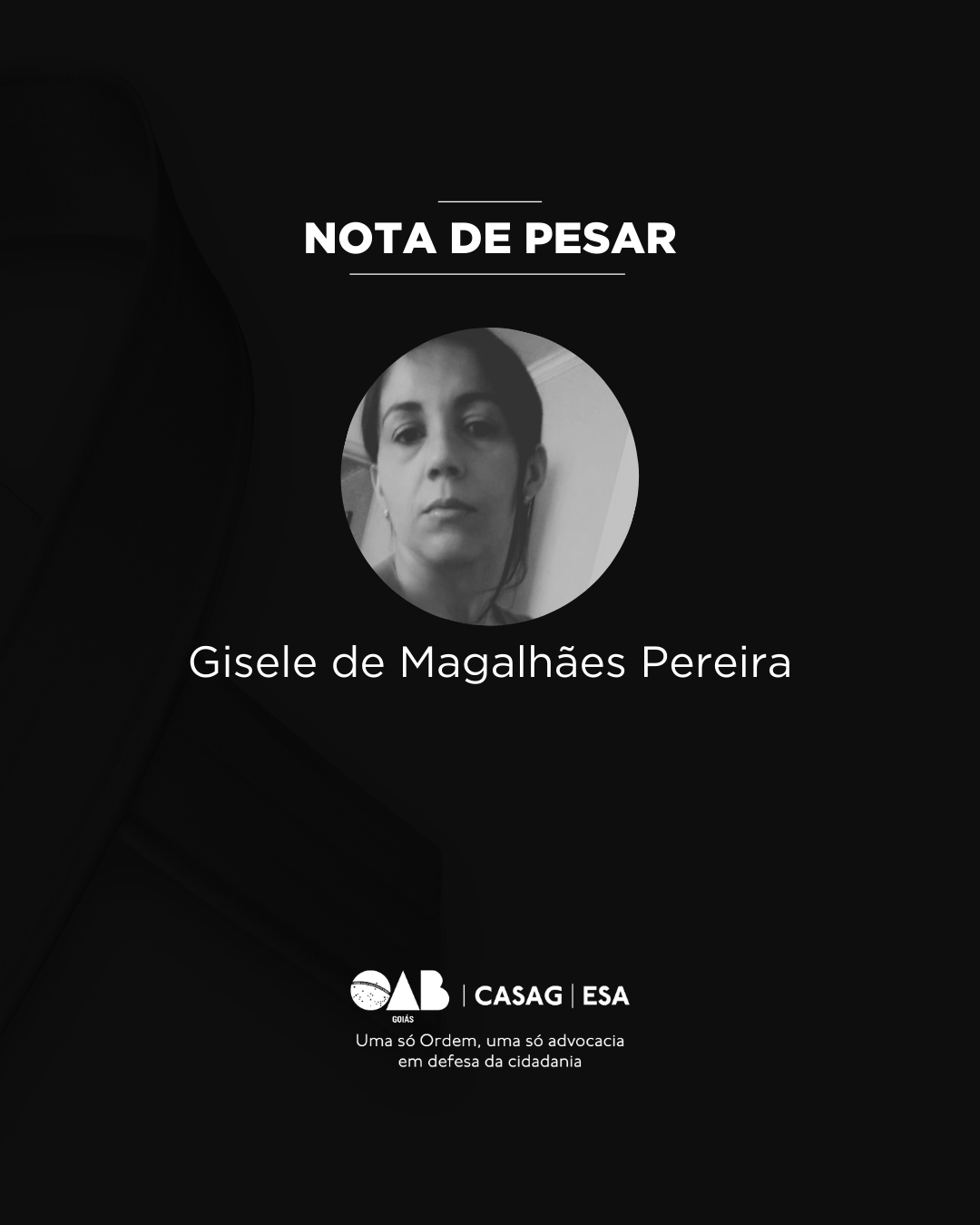 Neste momento de imensa dor, a Seccional e a Subseção de Aparecida de Goiânia se solidarizam com familiares e amigos, desejando que encontrem conforto nas memórias e no exemplo de vida deixado por Gisele. Que Deus, em sua infinita bondade, a receba de braços abertos.