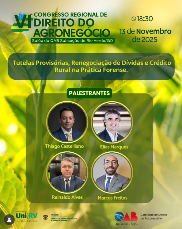 A subseção de Rio Verde da Ordem dos Advogados do Brasil – Seção Goiás (OAB-GO), por meio de sua Comissão de Direito do Agronegócio, promoverá no dia 13 de novembro, às 18h30, o VI Congresso Regional de Direito do Agronegócio, que nesta edição traz o tema central “Tutelas Provisórias, Renegociação de Dívidas e Crédito Rural na Prática Forense”. O evento será realizado no auditório da sede da OAB Subseção de Rio Verde-GO.
