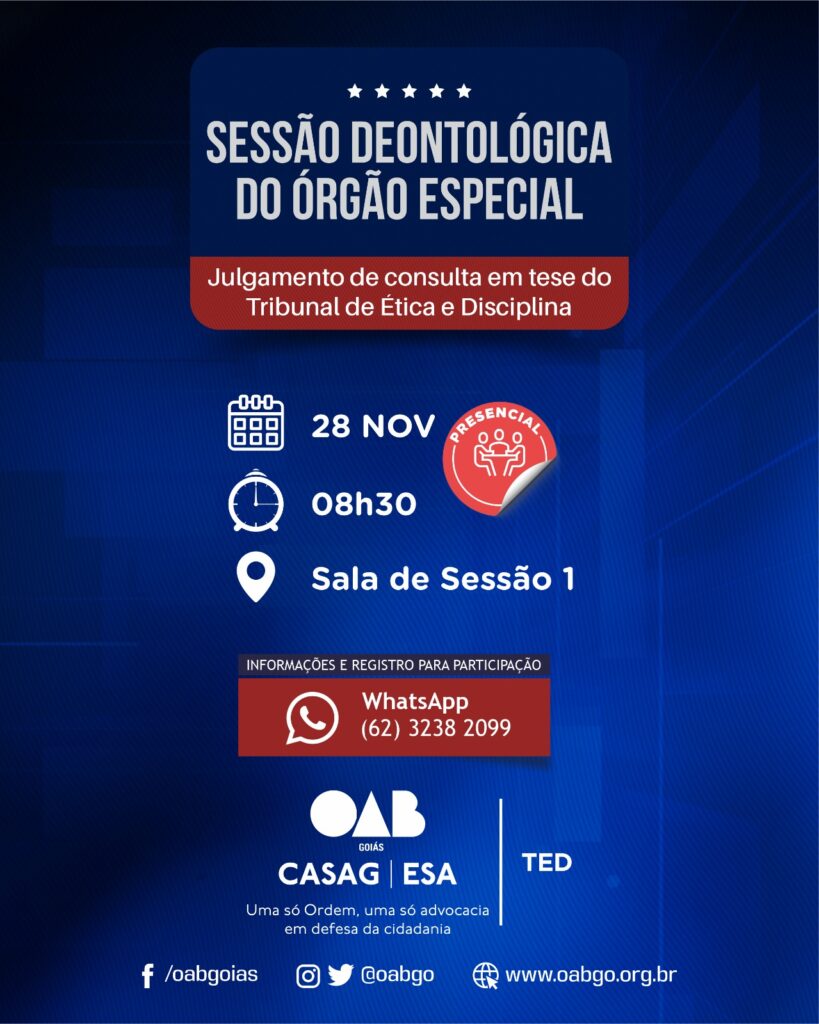 O Tribunal de Ética e Disciplina (TED) da Ordem dos Advogados do Brasil – Seção Goiás (OAB-GO) realiza nesta sexta-feira (28) sua quinta sessão deontológica, desde 2022, com objetivo de analisar e interpretar por julgamento de situação hipotética de seis consultas envolvendo participação da advocacia em entrevistas a veículos de comunicação, revogação de procurações e assunção de mandatos e uso de prints na conversa entre advogados e clientes em processos judiciais.
